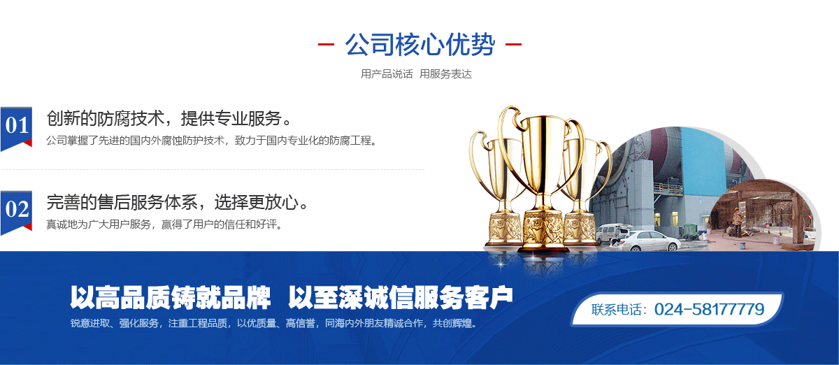 2004;GB/T28001-2011/OHSAS18001:2007;GB/T19001-2008/ISO9001:2008認證 體系,取得了化工防腐蝕施工資質等級一級單位,遼寧省腐蝕與防護學會防腐施工專業委員 會主任委員會主任委員單位,是中國石油撫順石油化工公司網內成員單位。幾年來本著“客 戶為尊、精益求精”的服務宗旨,服務于基礎設施、石油、化工、治金、化纖、能源、礦山、 核電站、海洋工程等眾多行業企業。 ![]() ![]() ![]() ![]() |